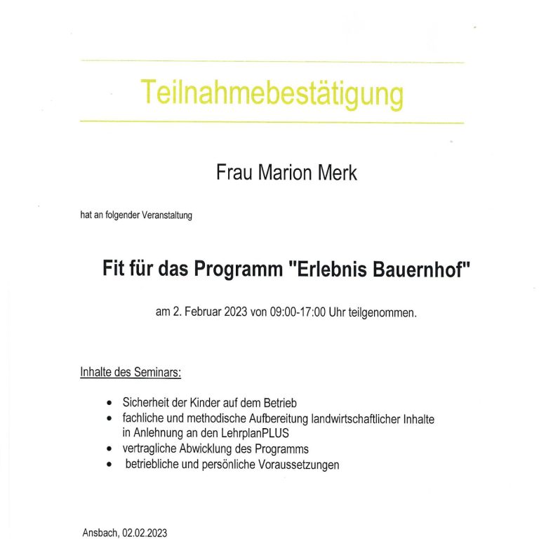 2009/2010 hat die Seniorchefin, Christine Prischenk, in 4 Modulen an 15 Seminartagen eine professionelle Ausbildung zur Erlebnisbäuerin unter der Leitung des Bayerischen Staatsministeriums für Landwirtschaft, Ernährung und Forsten absolviert. Dabei habe ich ein pädagogisch fundiertes Konzept für unseren Betrieb ausgearbeitet und eine praktische Prüfung abgelegt.